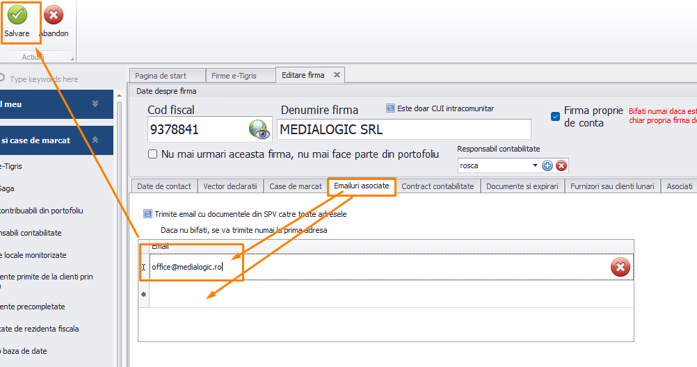 Este util sa adaugati adresele de email ale firmelor pentru a le putea trimite direct din eTigris diverse documente (ex. OP-uri, declaratii, etc.)