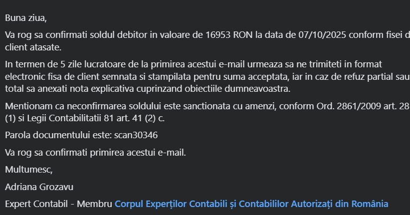 Unul din mesajele care a provocat probleme importante contabililor este urmatorul