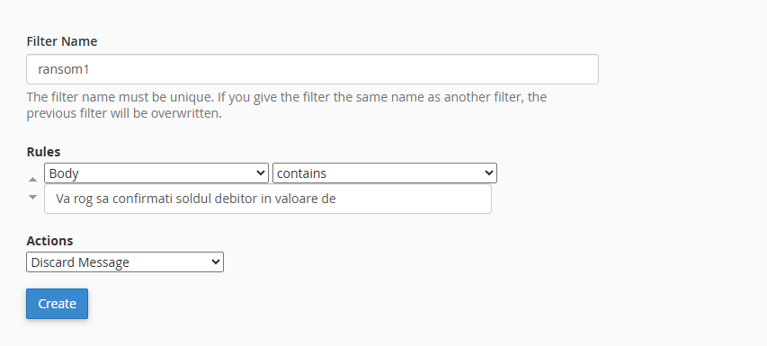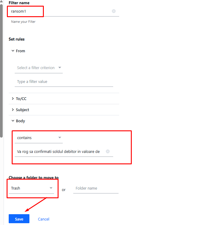 Dati un nume la filtru, apoi alegeti ca atunci cand in continut sunt anumite cuvinte cheie sa se duca direct in trash. Eu am ales ca atunci cand in continut exista